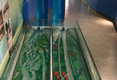 Das Überschwemmungsbecken veranschaulicht die Folgen starker Regenfälle bei ursprünglich mäan-drierendem Flusslauf und stellt einen Vergleich zum kanalisierten Flusslauf her. Durch Drücken einer Taste wird der Wasserstand des Flusses erhöht und das Verhalten des Wassers in verschiedenen Landschaftsmodellen simuliert.